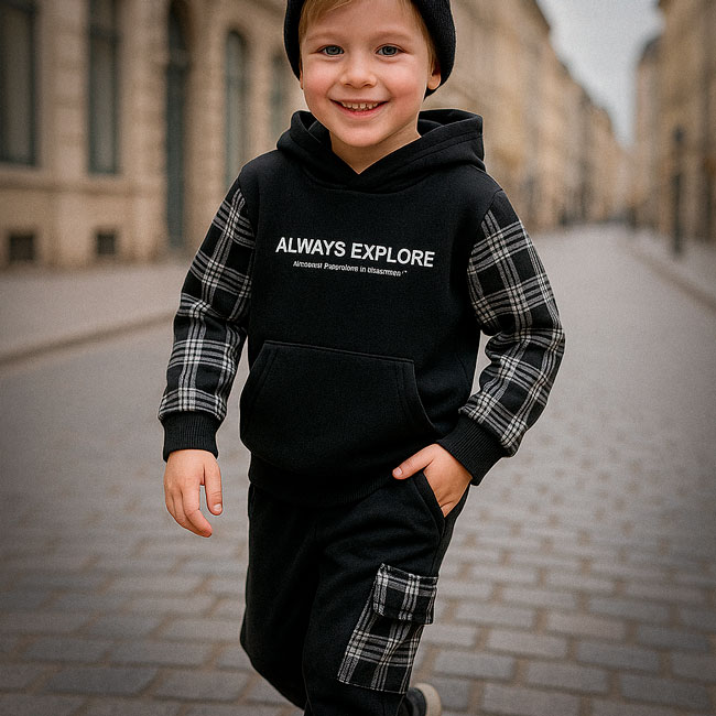 Еластичний пояс на штанах і продуманий крій гарантують свободу рухів, дозволяючи дитині залишатися активною та мобільною. Капюшон додає практичності, захищаючи від вітру та холоду.