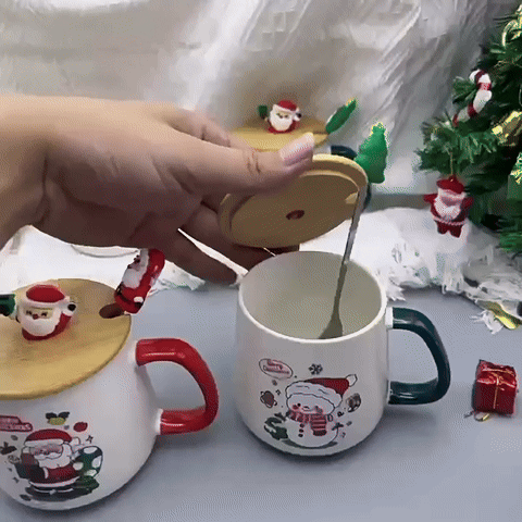 Керамічна кружка з новорічними малюнками та зручними кришками прикрашена маленькими фігурками Санти. Такий дизайн створює святковий настрій і додає тепла кожній чашці чаю чи кави.
