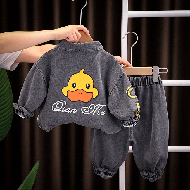 Костюм складається з джинсової куртки, футболки й штанів із яскравими принтами жовтої качки. Дизайн піднімає настрій та надає дитині оригінального вигляду, який точно приверне увагу.